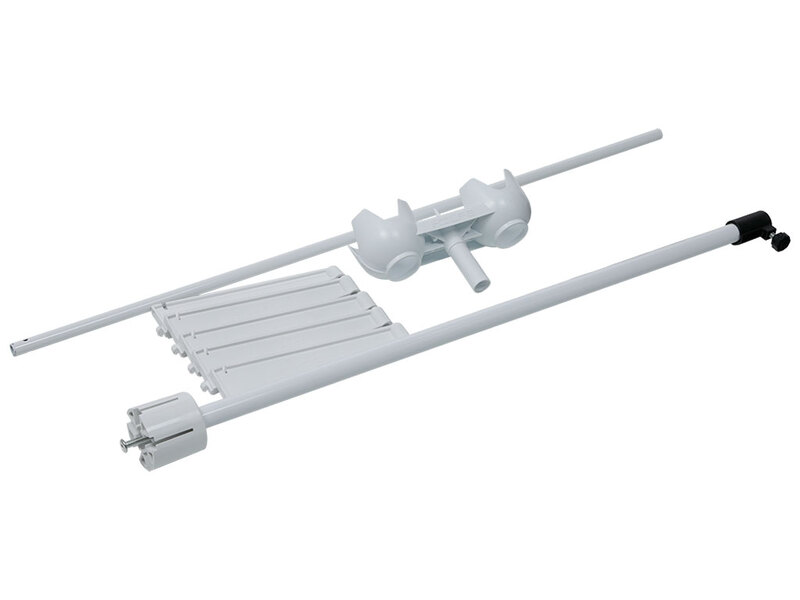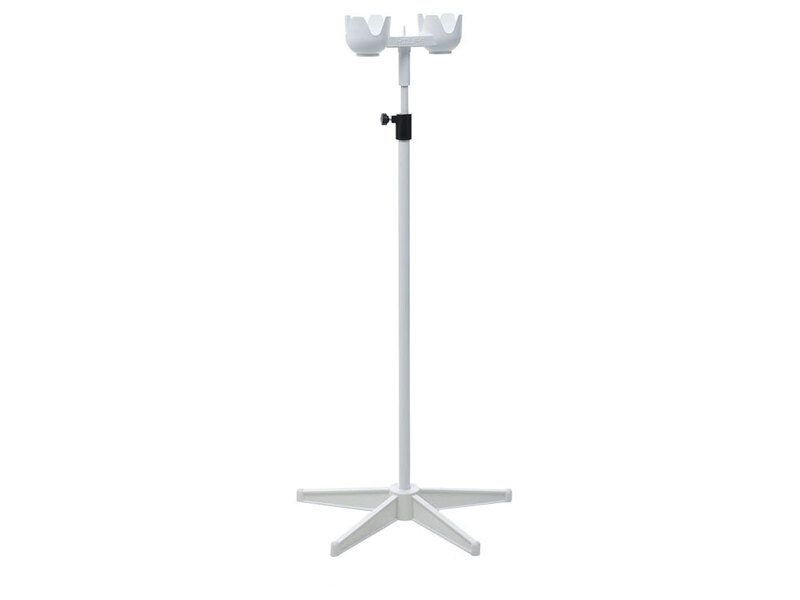 - Стойка выполнена из стальной трубы Ø16*1,5 мм, Ø25*1,5 мм и окрашена порошковой полиэфирной краской. Флаконодержатель выполнен из пластика белого цвета. Лучи основания выполнены из полиамида. Основание сборно-разборное